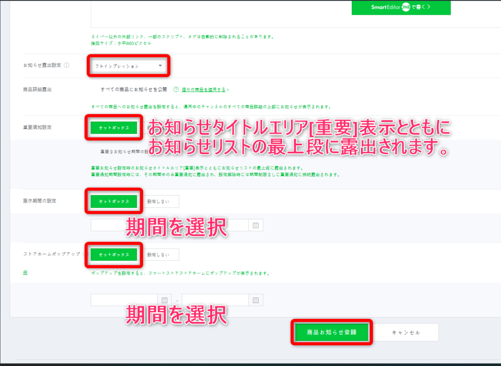⑤「商品お知らせ詳細」は、自分で書く(Smart Editor ONE)とHTMLで書くを選べます。