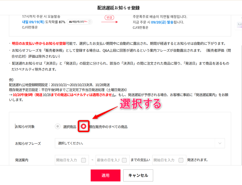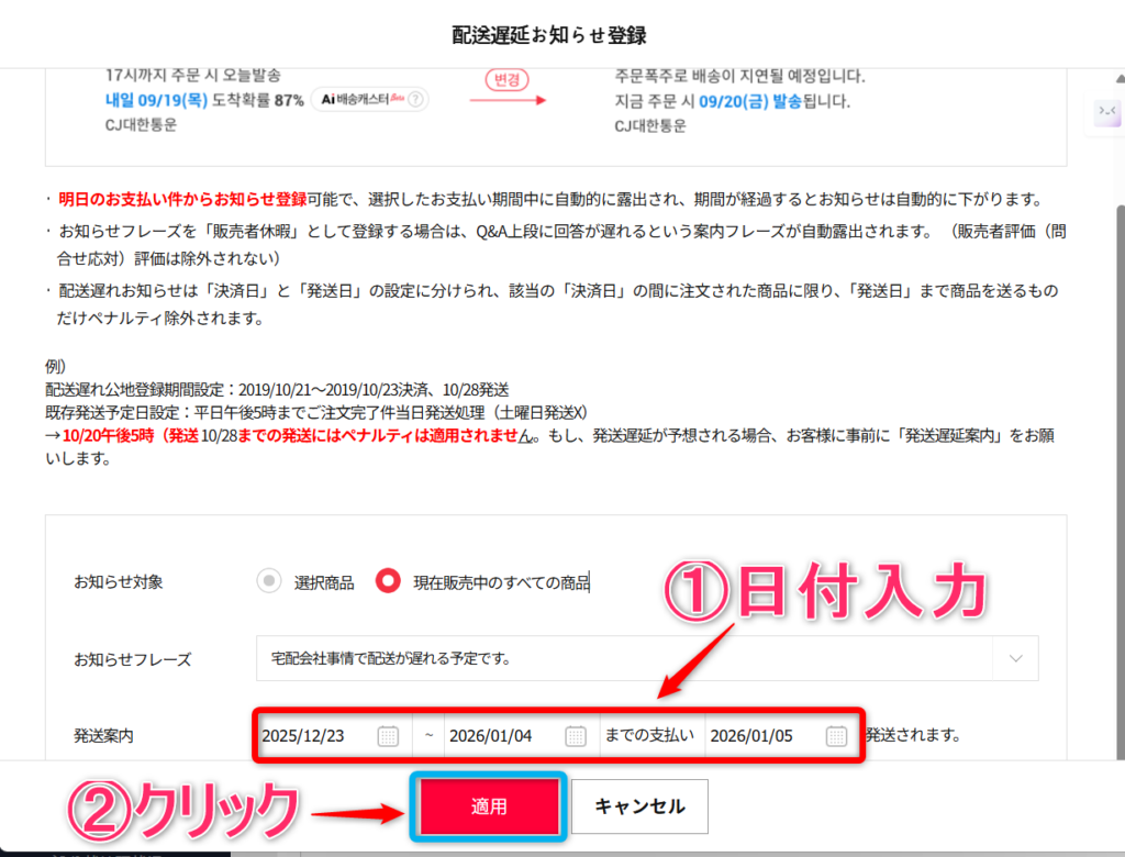 - 韓国では休暇中でなくても日本の連休中(祝日など)に配送会社が休んだ場合、発送できないため、ECモールの休暇設定が必要です。