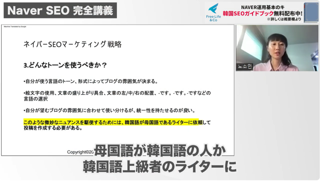 翻訳ツール任せの機械翻訳は、前述した読み手の不自然さ・不信感の発生はもちろん、Naverからもブログが低評価を受けます。ビジネス発信なら、ネイティブ・高レベル通訳者の翻訳一択です。