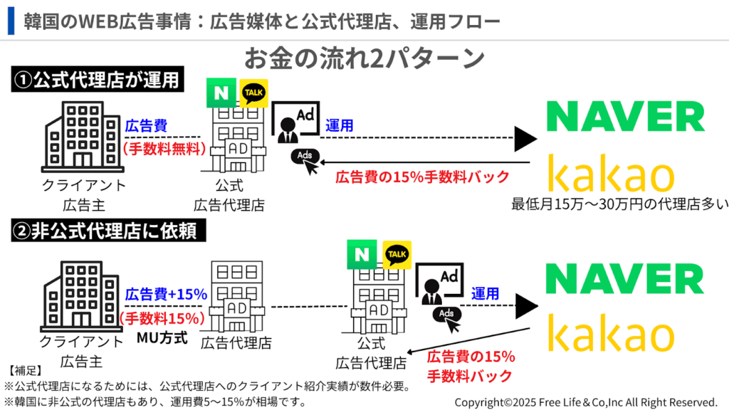 「無料で運用してくれるなんて、そんな上手い話ある?」とお思いでしょう。このカラクリは、NAVER・kakaoといった媒体側が公式代理店に対して、広告費の15%をキックバックする仕組みがあるから成り立っている訳です。