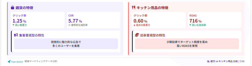 雑貨は集客重視型、キッチン用品は効率重視型であり、対照的な特性が見て取れます。雑貨は視覚的に魅力的な広告で多くのユーザーを集客、少額投資でターゲット精度を高め、高いROASを実現できています。