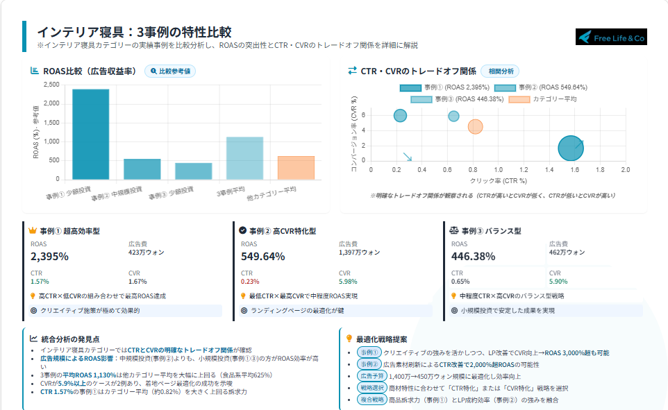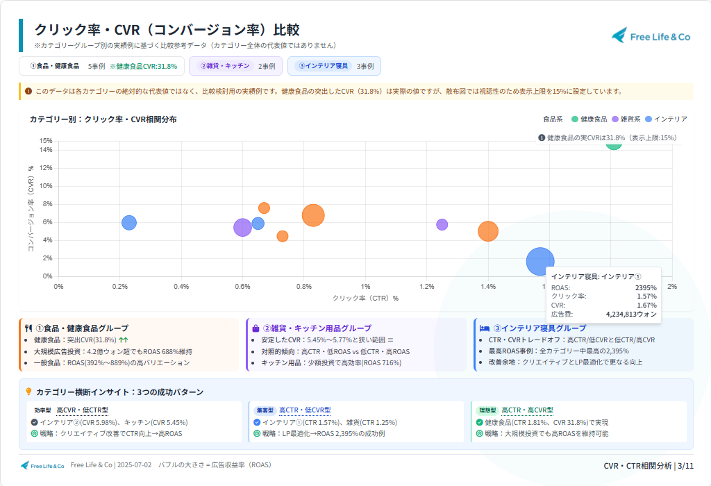 3事例 ROAS: 446〜2,395%明確なCTR×CVRトレードオフ