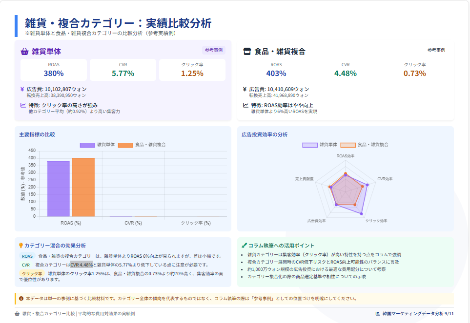 ・雑貨単体のクリック率1.25%は、食品・雑貨複合の0.73%より約70%高く、集客効率の面で優位性がある