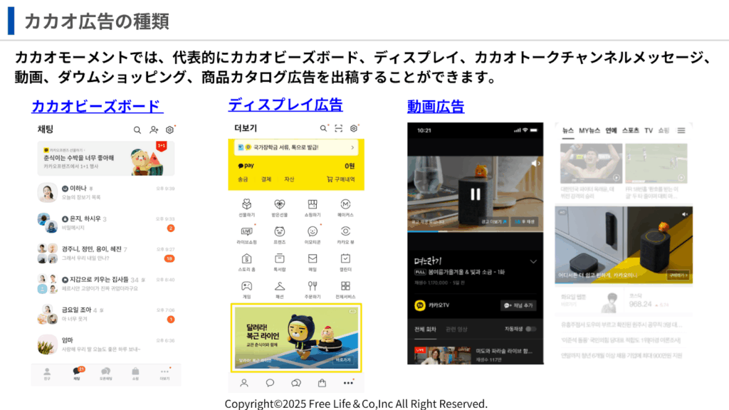 認知度を上げるなら、多くの人の目に触れることが重要です。YouTubeのインストリーム広告やカカオトークのビズボードは、圧倒的なリーチ力でブランド認知を広げるのに最適です。